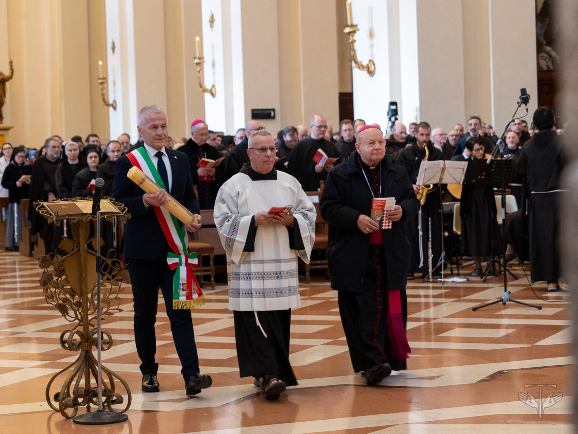 Protagonisti di questo gesto saranno il Vescovo di Assisi-Nocera Umbra-Gualdo Tadino e Foligno Mons. Domenico Sorrentino e il Sindaco della città di Assisi Valter Stoppini, in memoria della riconciliazione tra il vescovo e il Podestà di Assisi, cantata da Francesco come profezia di pace. Essi entreranno processionalmente nella Basilica portando un cero spento, segno dell’umanità segnata dal conflitto e dalla fragilità.