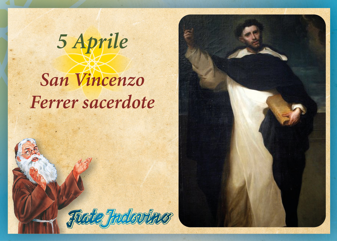 Vincenzo nacque a Valenza, in Spagna, nel 1350, ed era figlio di un notaio. Entrò nel convento domenicano della sua città, dove studiò e, in seguito, insegnò logica, filosofia e teologia. In quegli anni, la cristianità stava vivendo anni difficili, confusi: è l’età del “grande scisma d’Occidente”. A Roma viene eletto dai cardinali papa Urbano VI; ma una crisi tra l’eletto e gli elettori portò a una rottura e alla conseguente elezione di un secondo papa, Clemente VII, che si stabilì ad Avignone. Si crearono, così, due schieramenti politici, gli stati europei si divisero tra i due papi, il mondo era caduto nello sconcerto e nell’incertezza. Di fronte alla situazione creatasi, Vincenzo scelse di seguire papa Clemente VII, divenendo collaboratore del cardinale Pedro de Luna, legato del papa ad Avignone, di cui fu successore col nome di Benedetto XIII.
