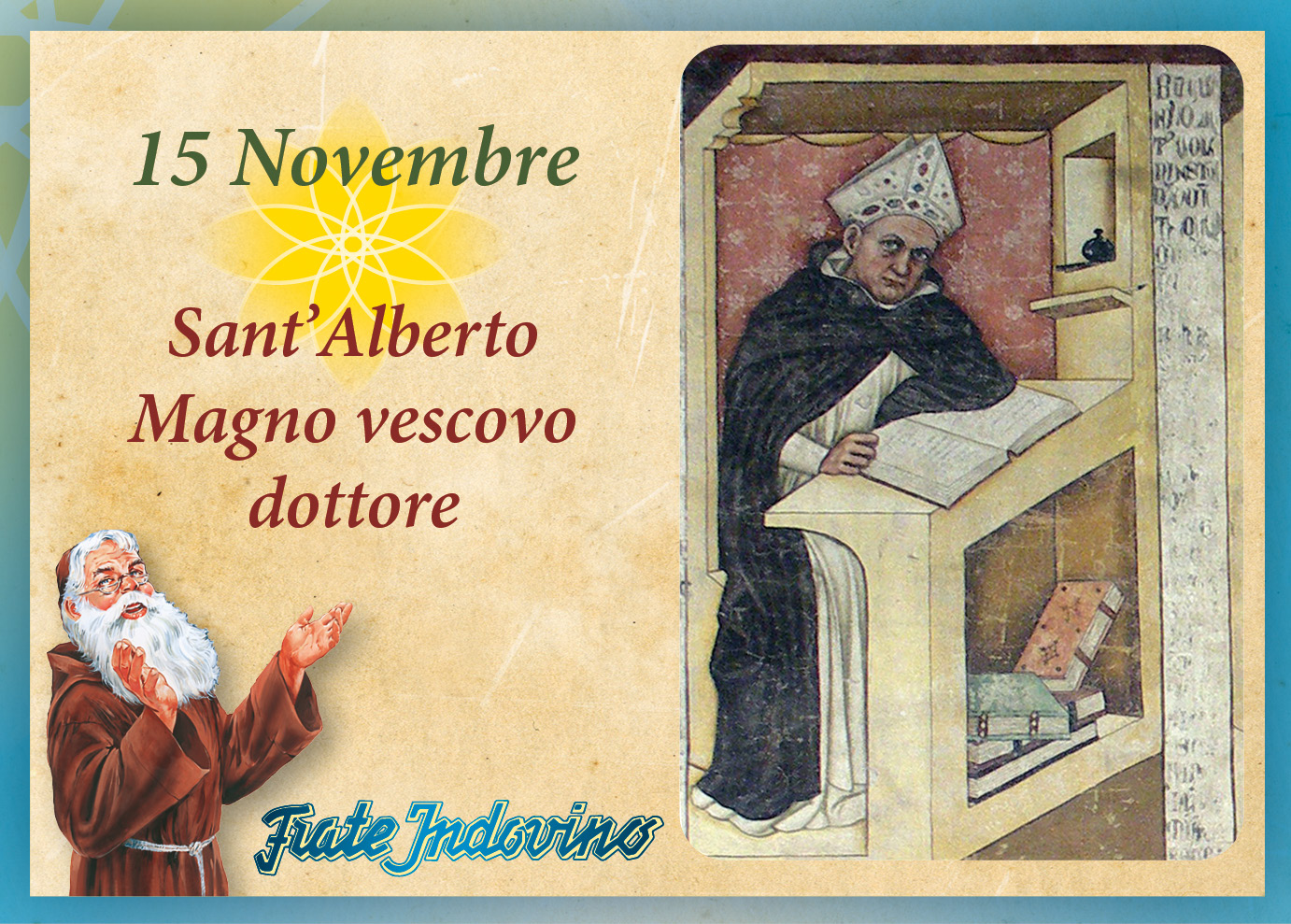 Alberto Magno nacque verso il 1193, sul Danubio, da famiglia di guerrieri. Elegante d’aspetto, gentile nei modi, acuto d’ingegno, entrò nell’Ordine Domenicano. Si dedicò agli studi, essendovi particolarmente portato. Insegnò in importanti Università europee e, a Parigi, fu docente di Tommaso d’Aquino. Nominato vescovo, dimostrò ottime doti pastorali, ma vi rinunciò per l’incarico, ricevuto da papa Urbano IV, di predicare la Crociata. Fu messaggero di pace fra i popoli; partecipò al Concilio di Lione, dove portò un contributo con la sua sapienza per l’unità della Chiesa Greca con la Chiesa Latina. Durante la vita si era occupato di filosofia, teologia, scienze, guadagnando il titolo di Dottore della Chiesa oltre quello di Magno.