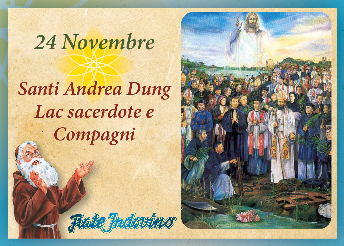 Andrea Dung-Lac era sacerdote vietnamita e, un giorno, stava attraversando il fiume in barca quando fu catturato dal segretario del prefetto. Fu sottoposto a lunghi e snervanti interrogatori, in cui fu invitato più volte ad apostatare e a calpestare la croce. Egli restò fermo nella sua fede e, nel 1839, fu decapitato. In questo stesso giorno vengono venerati centodiciassette martiri uccisi nel Tonchino, nell’Annam e nella Cocincina, una schiera di martiri di diversa nazionalità e condizione sociale. Tra di essi vi sono vescovi, sacerdoti, e una moltitudine di fedeli laici, mamme e padri di famiglia, soldati, contadini, artigiani, pescatori. Costoro hanno preferito l’esilio, il carcere, le torture e ogni tipo di sofferenza piuttosto che calpestare la croce e abiurare la propria fede. Hanno così fatto rifulgere la Gloria del Signore.