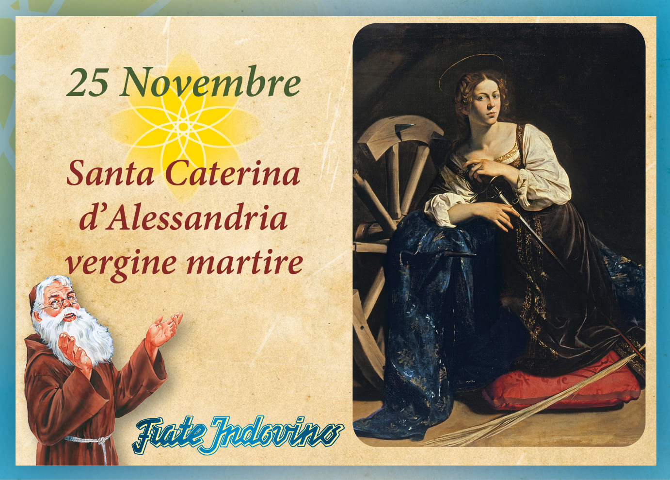 Caterina, di stirpe regale, nacque ad Alessandria, quando vi giunse Massimino Daia, nuovo governatore, che in occasione di grandiosi feste, obbligò a sacrificare animali alle divinità pagane. Ma, Caterina si presentò a lui per sostenere i cristiani e, addirittura, lo esortò a riconoscere il vero Dio. Le si ordinò di abiurare, ma ella convertì i sapienti che erano stati convocati per confonderla. Imprigionata, fu nutrita da una colomba e visitata da Gesù che la fece sua sposa mistica, infilandole l’anello al dito. Convertì l’imperatrice e i soldati. Quando fu sottoposta al martirio della ruota appuntita, questa si spezzò uccidendo i carnefici. Fu, allora portata fuori città e decapitata. Dal collo ne uscì latte e il suo corpo fu subito portato dagli angeli sul Monte Sinai, dove è custodito nell’antico monastero.