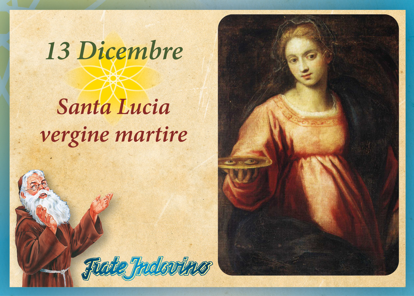 Lucia, fanciulla di Siracusa, era fidanzata con un ricco giovane. Insieme alla mamma molto malata si recò in pellegrinaggio sulla tomba di sant’Agata. Qui, la mamma ottenne il miracolo della guarigione e Lucia, spinta da una forte fede, decise di consacrarsi a Dio, dopo aver donato in beneficenza le sue ricchezze. Il fidanzato, esasperato dall’atteggiamento della giovane, intenta a distribuire il patrimonio, la denunciò come cristiana. Lucia subì un duro interrogatorio, che divenne una vera disputa dottrinale. Per piegare la sua fede, il proconsole la condannò a essere chiusa in un lupanare, ma ella affermò che nulla di quello che avrebbe potuto subire, per quanto violento, avrebbe intaccato la sua anima e la sua mente. Essa sarebbe rimasta comunque casta. La presenza in lei del supporto dello Spirito Santo rese il suo corpo pesante e inamovibile. Fu così torturata, violentemente, e infine, trafitta con la spada. I persecutori, le tolsero gli occhi e per questo è considerata protettrice della vista. Lucia: la luce; portatrice di luce. Questi i simboli del nome. Santa Lucia, martire, ha fama grandissima, si può definire una figura universale, perché la sua testimonianza e la sua storia hanno realmente superato i limiti del suo sepolcro e i confini fisici dei luoghi natali, divenendo “luce spirituale” dei cristiani.