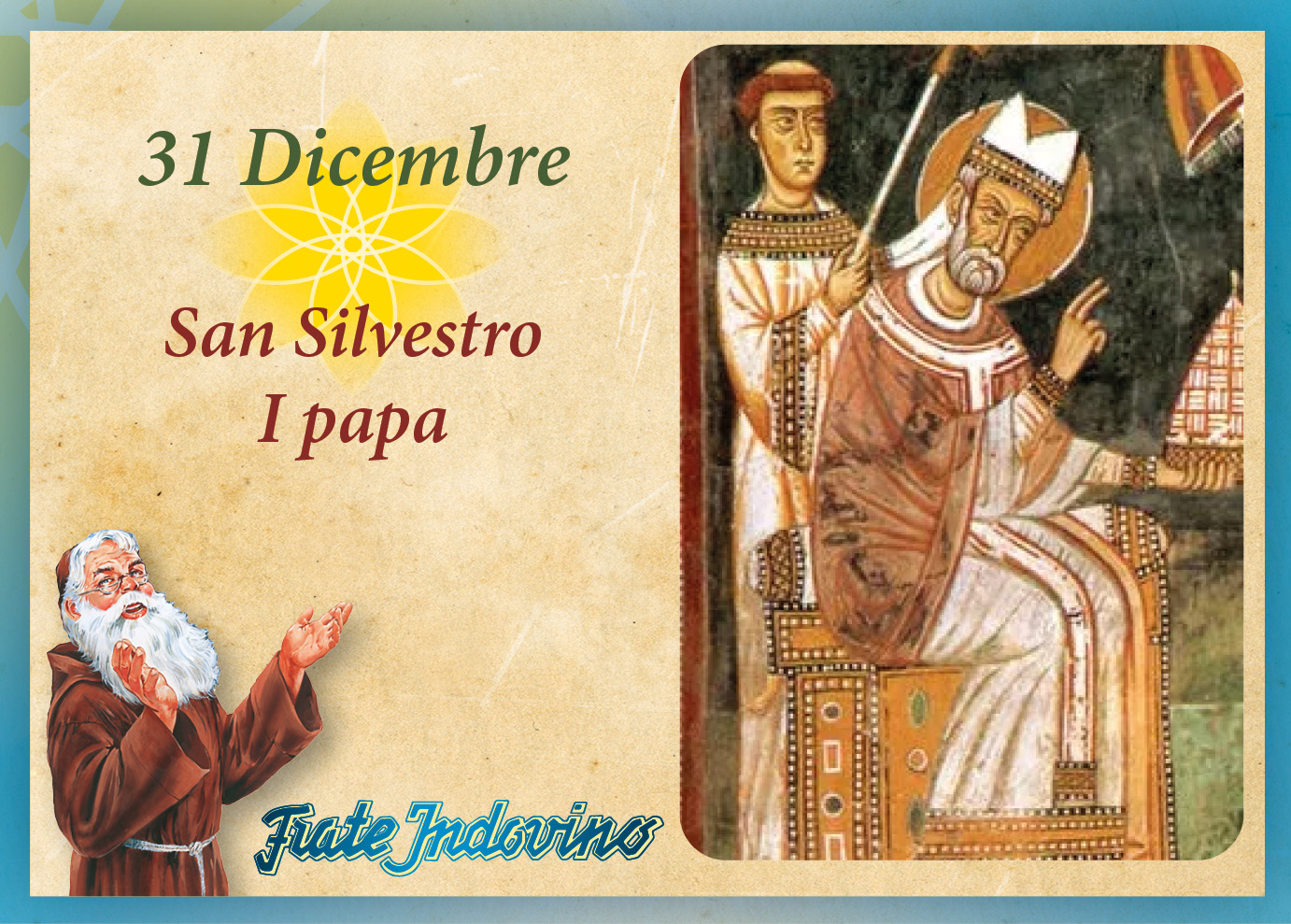 Celebriamo l’ultimo santo dell’anno: Silvestro. Egli fu Papa (314-335) al tempo dell’Imperatore Costantino e fu il primo Papa di una Chiesa non più terribilmente perseguitata. Nell’anno 313, infatti, gli Imperatori Costantino e Licinio emanarono gli Editti sulla libertà di culto per i cristiani. A Silvestro, Costantino donò la residenza di Palazzo del Laterano, con la Basilica di San Giovanni e costruì la prima Basilica di San Pietro. Costantino fu un personaggio di grande autorità e la esercitò anche in campo religioso: praticò continue ingerenze negli affari della Chiesa e arrivò ad occuparsi, addirittura, di questioni di dottrina. Questo atteggiamento oscurò la figura del Vescovo di Roma, forse, ingiustamente. Il Papa fu semplicemente schiacciato dagli eventi, ma lasciò una testimonianza meritevole. Infatti, appena morto, venne onorato come “Confessore” (primo a ricevere questo titolo), riconosciuto a chi, pur senza martirio, ha trascorso una vita sacrificata a Cristo.