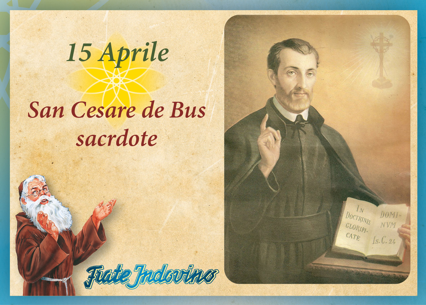 Cesare de Bus nacque a Cavaillon, in Francia, nel 1544, da una famiglia italiana. Nella sua prima giovinezza predilesse la vita militare e di corte, conducendo una vita agiata e dandosi ai piaceri dell’alta società. Una grave malattia lo spinse a profonde riflessioni interiori e ad aver cura dell’aspetto spirituale della sua persona, fino a giungere alla conversione. Questo cammino lo portò alla crescita di una vita nuova e scelse il sacerdozio. Sin dai primi passi si sentì chiamato all’attività del catechismo. Cesare viaggiò nelle campagne arretrate, dove vi era molta ignoranza religiosa tra la gente semplice. L’idea era di diffondere il catechismo ed egli non si limitò a catechizzare solo i bambini, ma studiò una catechesi per l’intera famiglia, pensando che in questo modo si poteva combattere l’ignoranza del popolo. Cesare fondò una nuova congregazione, che chiamò Preti della Dottrina Cristiana o dottrinari. I membri vivevano in comunità senza pronunciare i voti religiosi; ma in un secondo momento comprese il valore del fatto che formulassero almeno i primi voti. Formò anche un gruppo di religiose, le Figlie della Dottrina Cristiana. La sua vita spirituale era caratterizzata dallo spirito di penitenza, egli si offriva totalmente a Dio, abbandonandosi al suo volere. Attraverso l’insegnamento del catechismo riuscì a diffondere ampiamente il messaggio dell’amore di Dio e della redenzione per opera di Gesù.