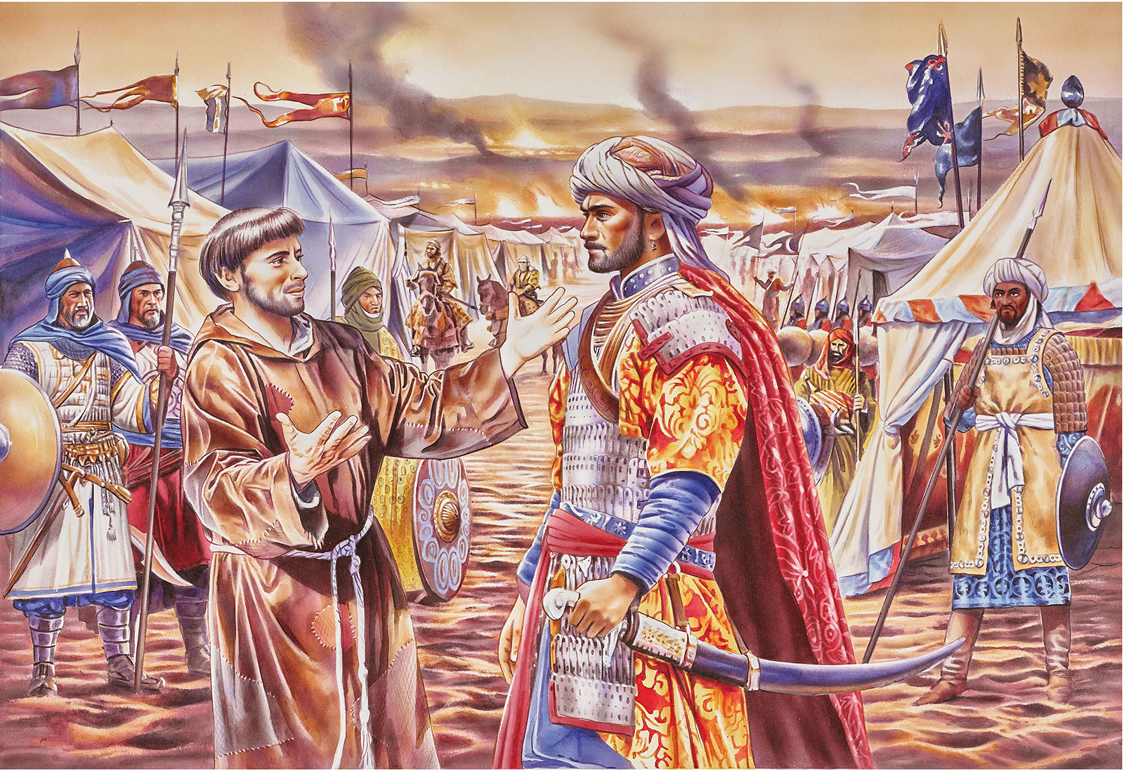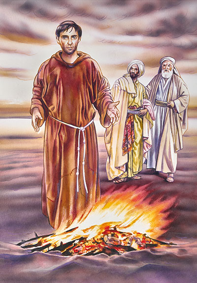 Nel 1219 l’Ordine dei Frati Minori nati con Francesco d’Assisi si era notevolmente ingrandito. Due anni prima, nel capitolo generale del 1217, Francesco e i suoi frati avevano deciso la prima missione d’oltralpe e d’oltremare. Una seconda missione venne decisa il 26 maggio 1219 durante il capitolo di Pentecoste. Nel mese di giugno dello stesso anno Francesco si imbarcò per l’Oriente, insieme a un compagno, e si stabilì alla foce del Nilo, a Damietta, dove erano stanziati i crociati. Qui contro ogni preconcetto corrente che voleva lo scontro violento con gli infedeli, durante una tregua nei combattimenti della quinta crociata, Francesco volle incontrare in maniera pacifica il sultano d’Egitto Malik al-Kamil. L’atteggiamento umile e mite di Francesco portò al dialogo e al rispetto reciproco tanto che il Santo poté tornare indietro sano e salvo. Tommaso da Celano, il primo biografo di Francesco, scrive che il Sultano «rimase profondamente stupito, e lo guardava come un uomo diverso da tutti gli altri. Era molto commosso dalle sue parole e lo ascoltava molto volentieri». La tradizione della prova del fuoco dipende dalla Legenda maior di san Bonaventura e diverrà motivo iconografico molto diffuso nelle raffigurazioni artistiche della vita del Santo. Francesco – secondo il racconto di san Bonaventura –, davanti al Sultano avrebbe invano sfidato i savi dell’Islam all’ordalia del fuoco per dimostrare che lui a differenza loro poteva entrare fra le fiamme e con l’aiuto di Cristo non patire nessuna ustione. Durante il soggiorno in Oriente, Francesco contrasse una grave malattia agli occhi (il tracoma) che andò gradualmente peggiorando dopo il suo rientro in Italia.