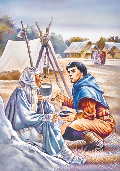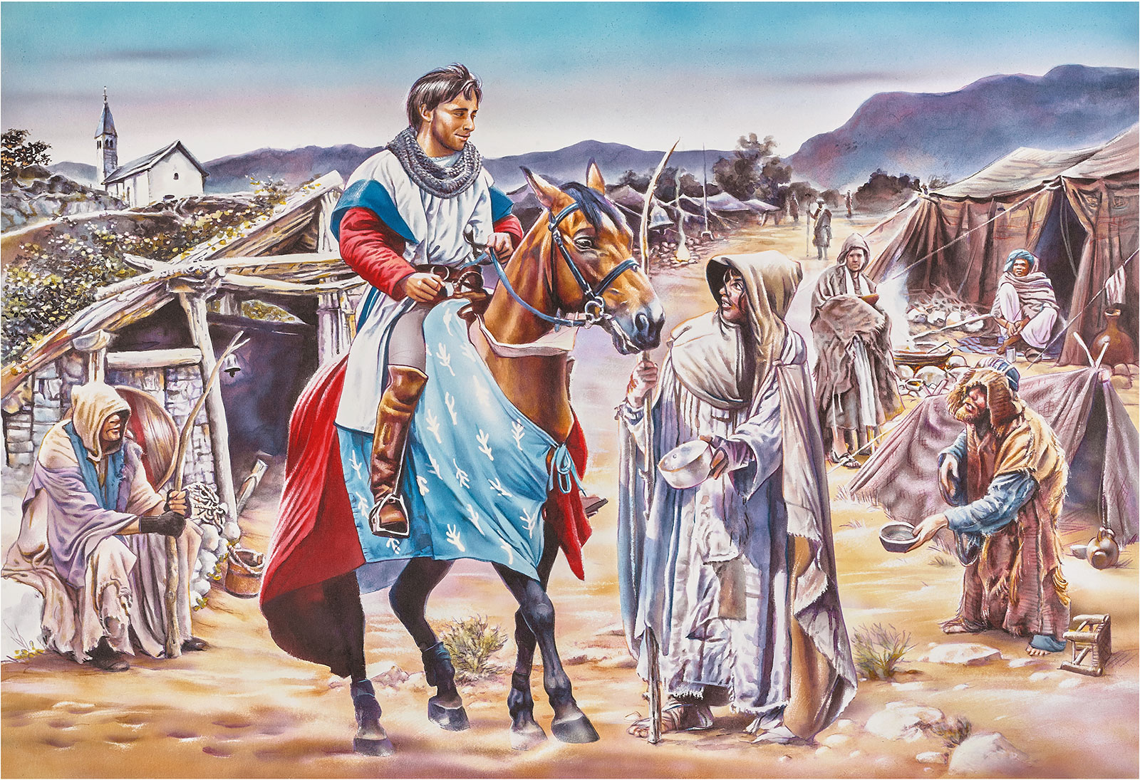 Tornato da Spoleto in Assisi alla fine di luglio del 1204 Francesco trascorse un lungo periodo di riflessione e di ricerca vocazionale. Si ritirava molto spesso a pregare in luoghi solitari o nelle grotte nascoste sul monte Subasio. Mentre un giorno cavalcava nei paraggi di Assisi, sospinto dalla grazia di Dio capitò nello “spedale” dei lebbrosi di San Potente. Confida Francesco stesso che la vista dei lebbrosi gli era talmente detestabile, che non solo si rifiutava di vederli, ma anche di avvicinarsi alle loro abitazioni. E se a volte gli capitava di passare accanto alle loro dimore o di vederne qualcuno, sebbene la compassione lo stimolasse a far loro l’elemosina per mezzo di qualche altra persona, lui però voltava sempre la faccia dall’altra parte e si turava le narici con le proprie mani per non sentire l’odore nauseabondo delle loro ulcere. Ma quel giorno, ciò che prima gli era tanto insopportabile si trasformò in dolcezza dell’anima e del corpo. Trascorsi pochi giorni, prese con sé molto denaro e si recò nuovamente all’ospizio, riunì tutti i lebbrosi e distribuì a ciascuno l’elemosina, abbracciandoli e baciandogli la mano. Da allora diventò compagno e amico dei lebbrosi, stava in mezzo a loro e li serviva umilmente. E così volle che facessero anche i suoi frati. Un giorno un frate aveva condotto alla Porziuncola un lebbroso sfigurato dalle piaghe. Francesco lo rimproverò, dicendogli che non avrebbe dovuto condurlo là, per ovvi motivi di sicurezza. Ma subito si pentì di quello che aveva detto, perché temeva di aver fatto vergognare il lebbroso. Così, per penitenza, volle mangiare nello stesso piatto con il lebbroso, che chiamava “fratello cristiano”.