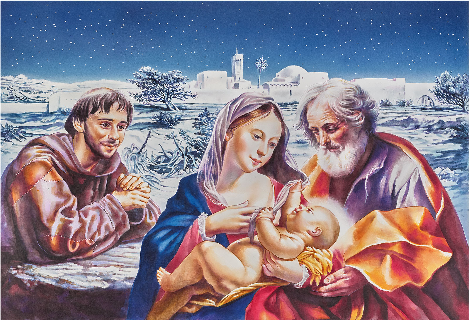 Il mistero del Natale è sintetizzato nelle parole dell’angelo ai pastori: «Vi annuncio una grande gioia: oggi è nato per voi il Salvatore, che è Cristo Signore!». La gioia è il frutto più che umano dell’Incarnazione del Verbo. Anche Francesco d’Assisi voleva che questa festa fosse contraddistinta da grande gioia e letizia. Voleva che quel giorno ogni creatura del Signore gioisse e che i cristiani provvedessero largamente non solo ai poveri, ma anche agli animali e agli uccelli. Nel 1223 volle rievocare la nascita di Gesù e volle farlo in un paese che gli ricordasse Betlemme: Greccio. Desiderava più di tutto vedere con i suoi stessi occhi le difficoltà e i disagi che aveva vissuto Gesù bambino, posto in una mangiatoia, sul fieno, scaldato dagli animali della stalla e senza nulla di ciò che ha bisogno un neonato. Due settimane prima del Natale, chiese a un abitante di Greccio, il nobile Giovanni Velita, di preparare in una grotta la scena della natività di Gesù con gli animali, il bue, l’asino, la mangiatoia con la paglia, e portare un altare per la celebrazione della messa. La notte del 24 dicembre 1223 a Greccio, Francesco, vestito dei sacri paramenti diaconali, lesse il Vangelo. E dopo la lettura del Vangelo predicò al popolo con profonda commozione e usando parole di grande dolcezza. Ciò che soprattutto lo commuoveva era il pensiero che Dio si fosse fatto bambino, così piccolo da doversi nutrire di latte umano, come ogni altro neonato. Secondo le agiografie durante la messa Francesco prese in braccio un bambino che dormiva nella mangiatoia e a tutti quel neonato sembrò il Bambino Gesù. La rappresentazione della nascita di Gesù a Greccio ha diffuso in tutto il mondo la tradizione cristiana di esporre il presepe nelle nostre chiese, nei conventi e nelle case private.