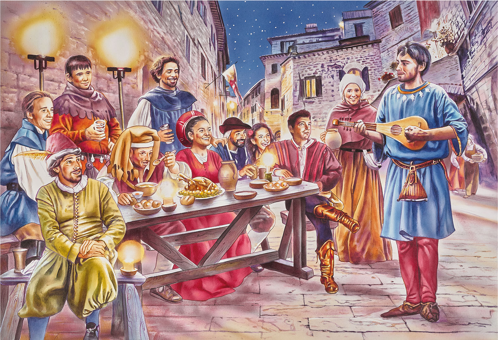 La fanciullezza di Francesco trascorse serenamente in Assisi, nella casa paterna presso la chiesa di San Giorgio. Ricevette la prima formazione in famiglia, dalla madre Pica, molto devota e pia. Di ingegno vivace, data la sua privilegiata condizione economica, frequentò la scuola presso i canonici della cattedrale di San Rufino imparando a leggere e a scrivere in volgare e acquisendo una discreta conoscenza del latino. Imparò anche il francese dalla madre e la musica, a cantare e recitare poesie in provenzale, nutrendosi di ideali cavallereschi e della cultura cortese dell’epoca. A quattordici anni il padre lo avviò all’attività della mercatura, destinato a prendere al momento opportuno le redini della grande azienda commerciale della famiglia. Francesco era allora un giovane allegro, non alto di statura, magrolino, i capelli e la barbetta scura, estroso ed elegante. Primeggiava fra i giovani e amava organizzare laute cene, in compagnia di liete e spensierate brigate, spendendo con una certa prodigalità il denaro paterno, tanto da essere acclamato re dei conviti e delle feste. Un giorno era intento nel fondaco paterno a riassettare la merce quando alla porta si presentò un mendicante che chiedeva l’elemosina in nome di Dio. Dapprima Francesco lo scacciò in malo modo, ma poi pentitosi lo seguì e raggiuntolo vi si intrattenne, scusandosi ed elargendogli dei denari. Era la spia di una sensibilità che di lì a qualche anno avrebbe trovato la sua più vera ragione. A vent’anni, nel 1202, partecipò alla guerra che contrapponeva Assisi a Perugia. Dopo la disfatta subita dagli assisani a Collestrada, egli fu fatto prigioniero e restò in carcere per un lungo terribile anno, fino al novembre 1203. La prigionia lo debilitò fortemente nel fisico e nell’animo. Tornato a casa, sopportò una lunga malattia dalla quale si riprese pian piano grazie alle amorevoli cure della madre.