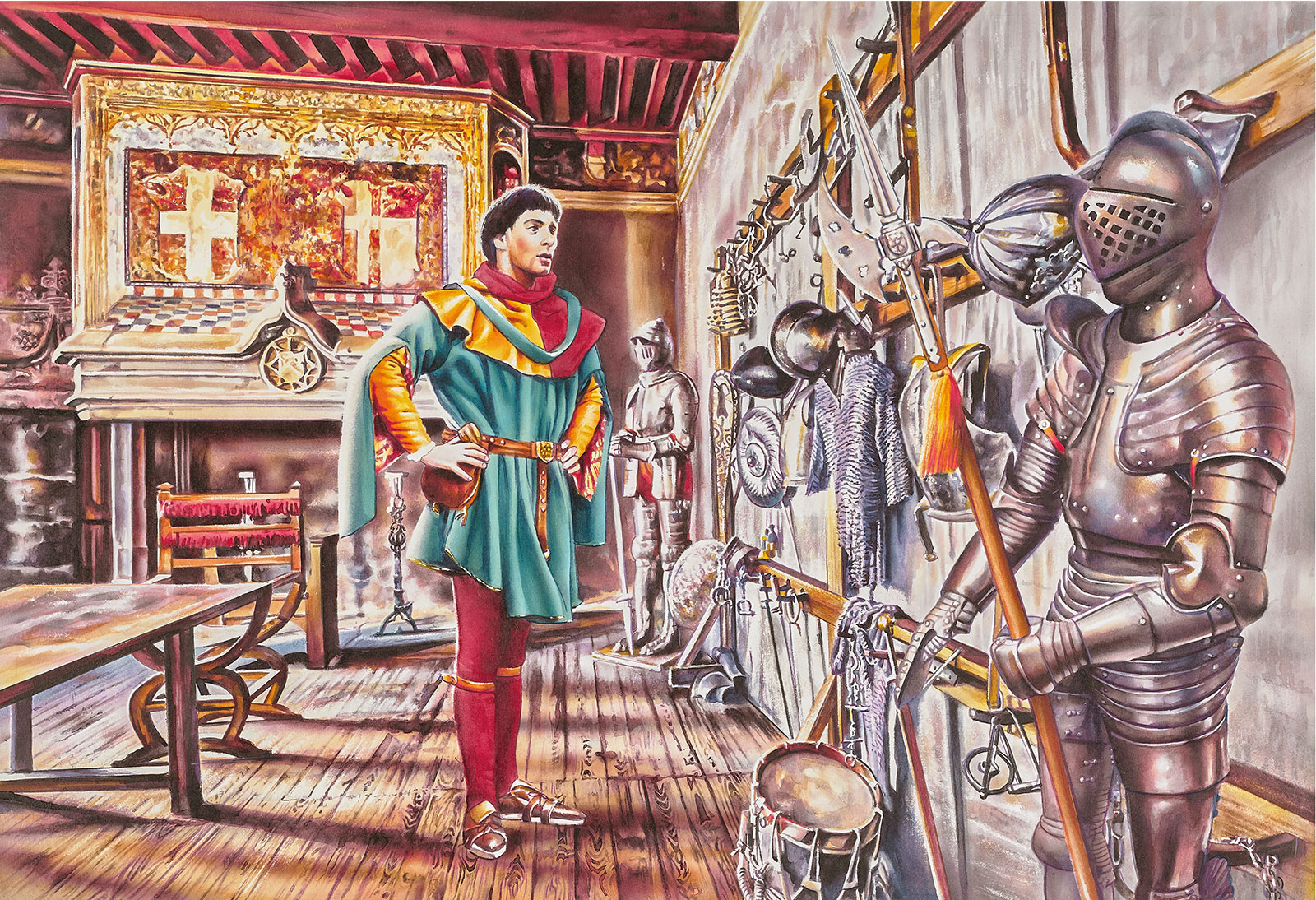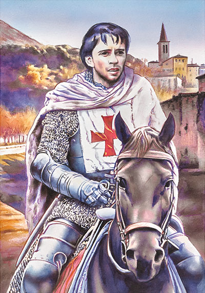Francesco fu partecipe della cultura e della mentalità del proprio ambiente sociale, in cui il figlio di un ricco mercante poteva aspirare a diventare un miles (cavaliere). Questa ambizione lo aveva spinto, ventenne,a partecipare alla guerra tra Assisi e Perugia e gli sembrò approvata da un sogno fatto la notte seguente a una sua buona azione verso un cavaliere caduto in povertà. Nel sogno gli veniva mostrato un grande palazzo pieno di armi, elmi, scudi, insegne. Alla domanda di Francesco di chi fossero quelle armature una voce gli aveva risposto che erano sue e dei suoi cavalieri. Risvegliatosi, a Francesco il sogno parve premonitore di una gloria militare. Decise così nell’aprile/maggio 1204 di partecipare alla quarta crociata e acquistare il titolo di cavaliere insieme alla gloria prefigurata dal sogno. Provò a raggiungere la corte del condottiero Gualtiero III di Brienne, in Puglia, per poi muovere con gli altri cavalieri alla volta di Gerusalemme. Partecipare come cavaliere a una crociata era a quel tempo considerato uno dei massimi onori per i cristiani d’Occidente. Tuttavia, giunto a Spoleto, Francesco cadde in preda ad uno strano malessere. Passò la notte nella chiesa di San Sabino e qui, in sogno, udì una voce misteriosa che lo invitava a “servire il padrone invece che il servo”. Fu l’inizio del cammino di conversione di Francesco, che ancora nel sogno chiese: “Signore che cosa vuoi che io faccia?”. Il Signore gli ordinò di tornare alla sua terra e seguire la volontà divina. Francesco rinunciò al proprio progetto di diventare cavalieree fece ritorno ad Assisi. Da allora egli non fu più lo stesso uomo. Lasciò definitivamente le allegre brigate dei vecchi amici per dedicarsi ad una vita di meditazione, preghiera e pietà, avvertendo nel suo cuore il desiderio di servire Dio solo.
