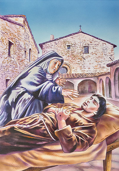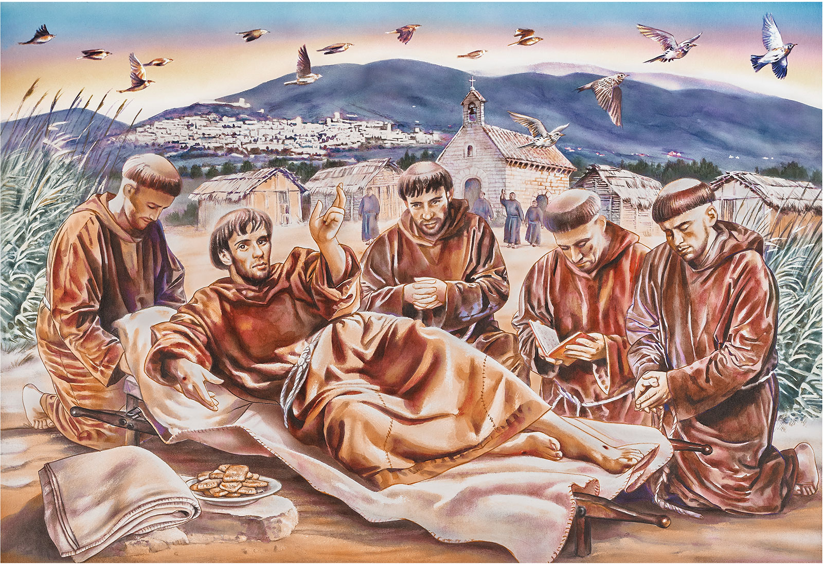 Nella primavera del 1226, mentre era a Siena, lo stato di salute di Francesco, già seriamente compromesso, si era ulteriormente aggravato. I frati che erano con lui lo portarono prima alle Celle di Cortona, poi a Bagnara e infine lo riportarono ad Assisi. Sentendo approssimarsi il momento della morte, Francesco dettò l’ultima strofa del Cantico di frate Sole: «Laudato si’, mi’ Signore, per sora nostra Morte corporale». Prevenendo il suo stesso desiderio venne a portargli il velo nuziale e dei mostaccioli Jacopa de’ Settesoli, che Francesco chiamava affettuosamente “frate Jacopa”. Francesco morì recitando il salmo 141, adagiato sulla nuda terra, presso la Porziuncola, attorniato dai suoi frati, dopo il tramonto del 3 ottobre 1226 (secondo il computo medievale era già il 4 ottobre). Aveva circa 44 anni. Le allodole, amanti della luce e timorose del buio, nonostante fosse l’imbrunire, vennero a roteare nel cielo su frate Francesco per rendergli gloria. Annunciandone al mondo la morte, il nuovo ministro generale dell’Ordine, frate Elia, rivelò di aver scoperto sul suo corpo i segni della passione di Cristo, e frate Leone, segretario e confessore di Francesco, confermò che l’amico e maestro aveva ricevuto quelle stimmate due anni prima, sul monte della Verna. Le esequie di Francesco si celebrarono il giorno seguente. Una solenne processione accompagnò la salma dalla Porziuncola alla chiesa parrocchiale di San Giorgio in Assisi. Poiché Chiara e le sorelle vivevano in clausura, prima di salire in Assisi, la processione transitò da San Damiano cosicché anche le monache potessero commiatare il Santo e vedere il segno prodigioso delle stimmate. Tutta la città era presente per rendergli onore. La notizia di quell’ultimo e incredibile miracolo aveva infatti accresciuto ancora di più la venerazione per il Poverello, che aveva finito per essere considerato un vero e proprio “Alter Christus”.