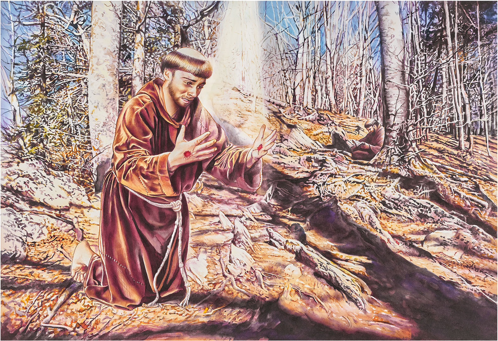 Dopo il capitolo di Pentecoste del 2 giugno 1224, in un momento di difficoltà dell’Ordine e di personale lotta interiore, il Poverello d’Assisi si ritirò sul monte della Verna per celebrare nel digiuno e nella preghiera una quaresima extra-liturgica in onore di san Michele Arcangelo. Una mattina verso la festa dell’Esaltazione della Santa Croce, mentre era nei boschi in preghiera, vide un Serafino con l’immagine del Crocifisso. La visione gli causò al contempo gioia, perché si sentiva ripieno dell’amore del Cristo, e profondo dolore, per la pena di vedere Gesù crocifisso. Quando poi il Serafino scomparve aveva impressi nel corpo i segni della Passione del Signore: le mani e i piedi confitti con chiodi e il costato trafitto. Era un fatto straordinario mai accaduto nella vita di un santo. Francesco è il primo stigmatizzato di cui si ha notizia nella storia della Chiesa. Il Santo tenne nascosti quei segni fino alla sua morte. Fu il ministro generale frate Elia che, in una lettera circolare a tutto l’Ordine, rese noto il prodigio. L’unico testimone diretto dell’evento soprannaturale fu frate Leone, il compagno più intimo di Francesco, suo confessore e segretario, che lo aveva accompagnato sul monte della Verna. Su una pergamena, donata al suo compagno e conservata oggi come reliquia nella Basilica di Assisi, Francesco, dopo aver ricevuto le stimmate, aveva scritto la “Benedizione a frate Leone” e le “Lodi a Dio Altissimo”. Sulla stessa pergamena, frate Leone menziona la visione del Serafino e la “impressio stigmatum” nel corpo di Francesco.